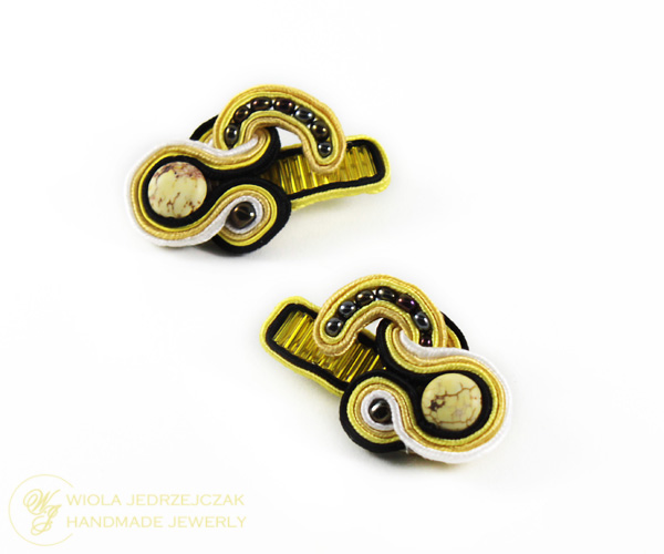 Mniejsze kolczyki wykonałam z użyciem kamienia howlitu żółtego oraz szklanych koralików i rurek.