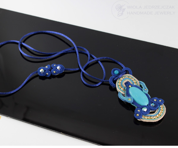 Naszyjnik w kolorystyce niebiesko turkusowo złotej, w jego sercu wszyty został kamień naturalny turkus.